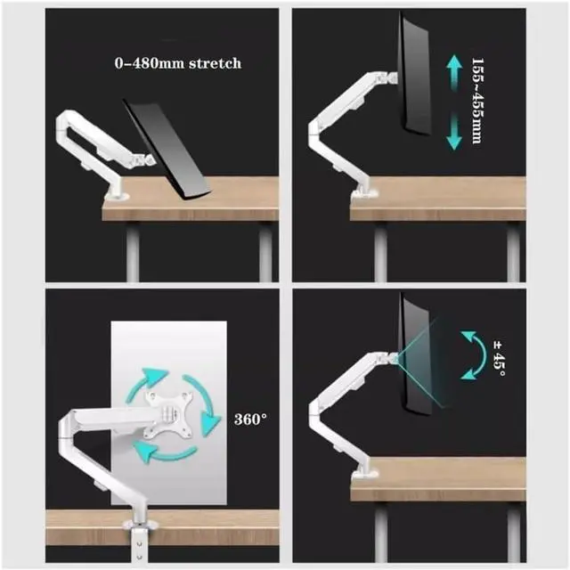 Easy to AdjustThis monitor desk mount with gas spring arms offer a wider range of movement. Single monitor desk mount arms can extend up to 18.9" long, and rise up to 16.33" in height. Easy to find the right viewing angle and position. Supports screen rotates 360° for landscape or portrait orientation, swivels 180° to share your display, and tilts up 90°/down 45° for better viewing.