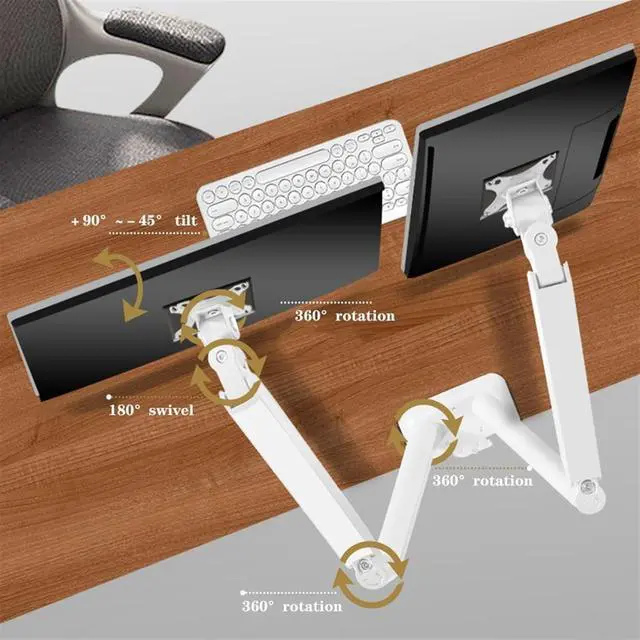 This dual monitor arm features +/-90° swivel to direct the screen toward your position, +90°/-45° tilt to help reduce glare, and 360° rotation to choose landscape or portrait mode. The dynamic screen positioning allows you to find the perfect viewing angle for both of your screens.