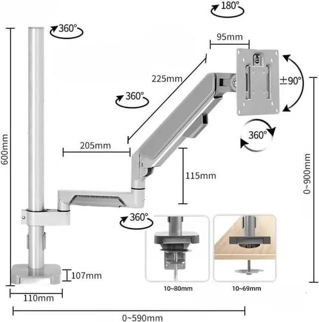 Fully Adjustable Single Monitor Stand : The single monitor mount offers +90° to -90° tilt, 180° swivel, 360° rotation. Our gas spring vesa monitor mount is easy to adjust, just push the monitor arm up or down with only one hand to accurately stop at the most comfortable height for you (up to 23.6 inch from the desktop)