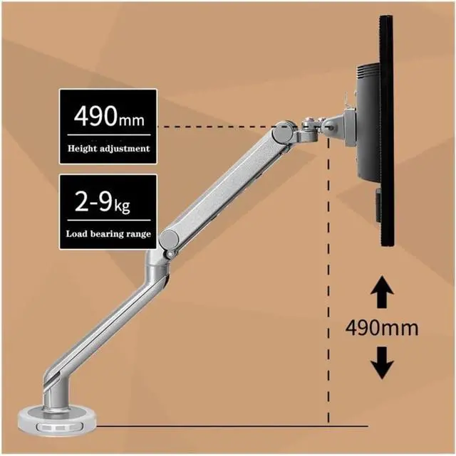 Single monitor stand easily adjust due to the mechanical spring system, raise, lower, pull, and push your monitor, including a max arm height of 19.29", up to 20.47" of arm extension, +90°/-85° monitor tilt, 180° swivel, and 360° rotation to find the perfect working position and most comfortable viewing angle.