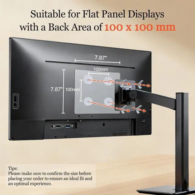 Universal Adapter: Effortlessly mount your 24-32 inch monitor using the 7.87*7.87 inch flat back area. Compatible with all VESA plates, easily installs via standard 100x100mm holes for a secure, versatile setup.