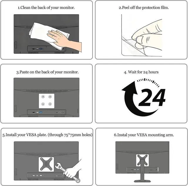 Easy Installation: Quick and tool-free! Simply peel off the protective film, stick the adapter firmly to your monitor's back, and after 24 hours for the adhesive to fully cure, you can securely mount it onto any VESA arm or stand.