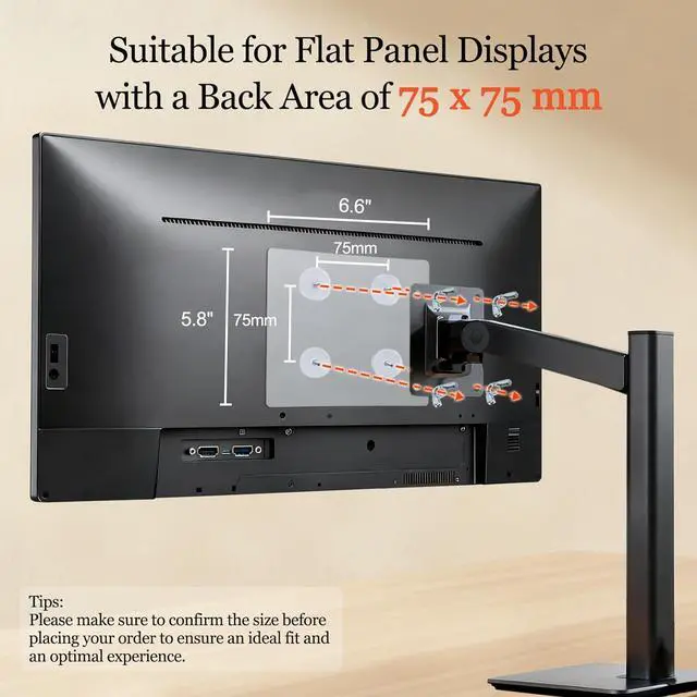 Non-VESA Monitor Mounting Solution Use this adapter to convert an old Non-VESA flat screen monitor to a VESA standard monitor with 75X75mm mounting screws. No more clunky visible brackets.