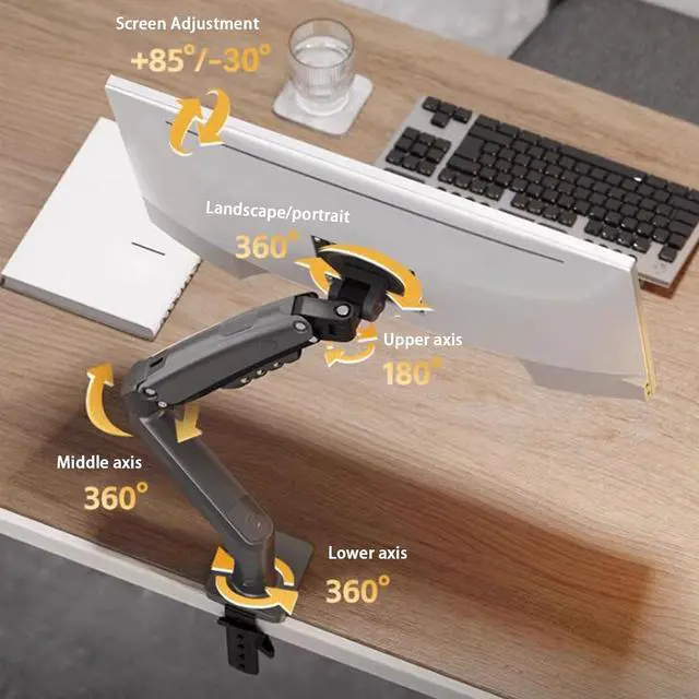 EASY INSTALLATION: Tool-free desk mounting system with three-step setup process, featuring adjustable clamp mount for quick and secure attachment