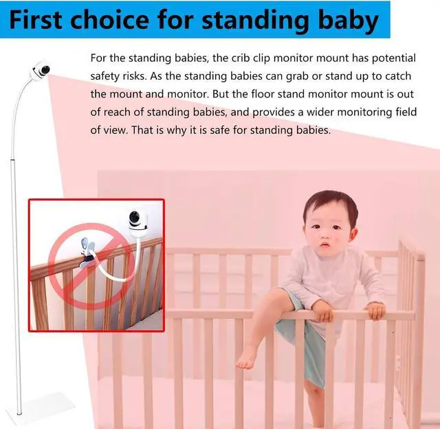 1st CHOICE FOR STANDING BABY: For the standing babies, the crib clip monitor mount has potential safety risks. As the standing babies can grab or stand up to catch the mount and monitor. But the floor stand monitor mount is out of reach of standing babies, and provides a wider monitoring field of view. That is why it is safe for standing babies.