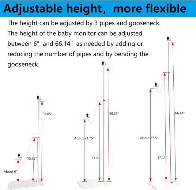 SAFE TO YOUR BABY: The gooseneck is very sturdy to support the monitor without sagging, moving, deforming; the base is widened, lengthened, thickened and heavier to support pipes and camera firmly without swaying and falling; 66.14height and 360°bendable providing a longer and wider field of view.