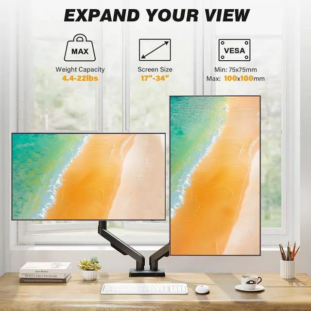 [Universal Compatibility for 17-34 Inch Monitors] This monitor arm is designed to fit most flat or curved screens from 17 to 34 inches, supporting VESA patterns 75x75mm and 100x100mm. With a weight capacity ranging from 4.4 to 22 lbs, it accommodates a wide variety of monitor models, making it a versatile vesa mount solution for any desk setup.