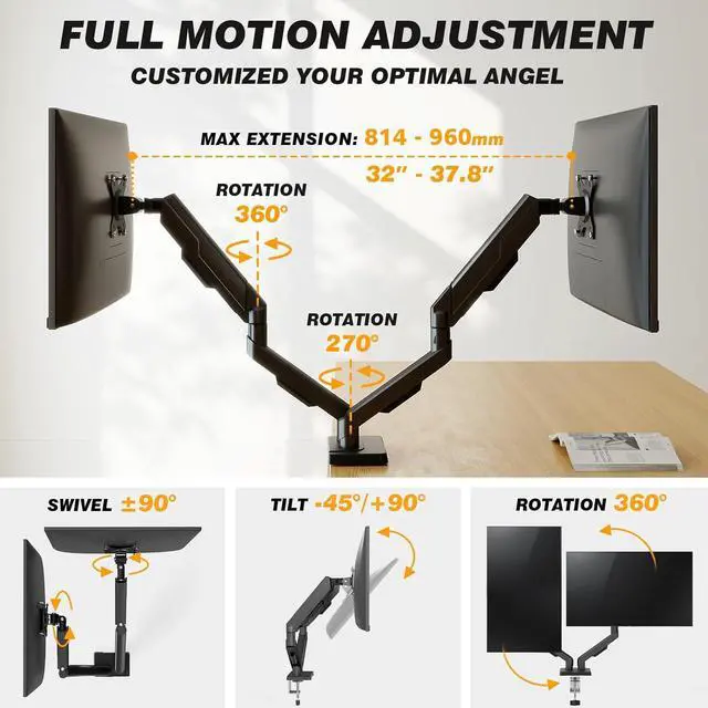 [Full-Motion Flexibility for Optimal Viewing] Enjoy complete control over your screen positioning with ±90° swivel, -45° to +90° tilt, and 360° rotation. Whether you're working, gaming, or sharing your screen, this monitor mount lets you effortlessly adjust to the perfect anglereducing glare and neck strain throughout the day.