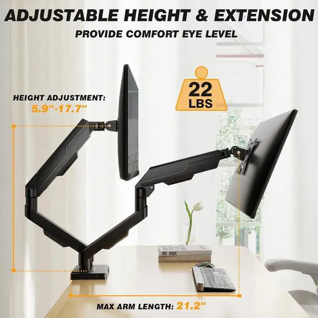 [Extensive Height & Reach Adjustment] Customize your workspace with height adjustment from 5.9" to 17.7" and a maximum arm extension of 21.2". This dual monitor arm provides the flexibility to position your screen exactly where you need it, creating a more ergonomic and comfortable work environment.