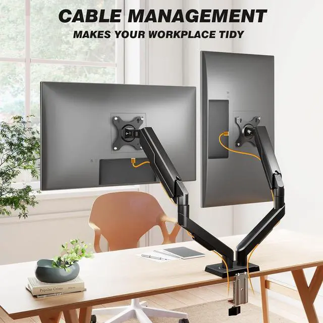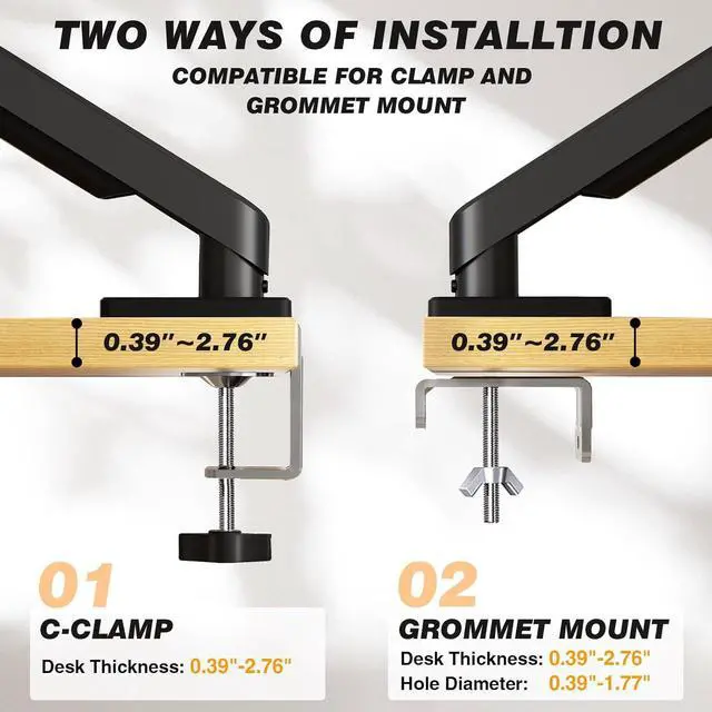 [Two Installation Options & Cable Management] Choose between C-clamp or grommet mount for secure desk attachment, compatible with various desk types. Built-in cable management channels keep wires neatly organized and out of sight, maintaining a clean and professional workspaceideal for those seeking monitor arms for 2 monitors or a streamlined single-screen setup.