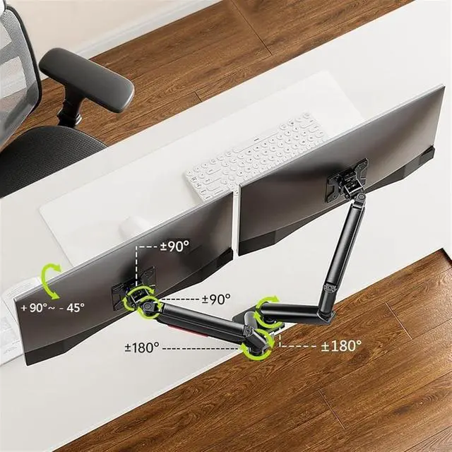Maximum Flexibility: The monitor mount features +/-90° swivel, +90° to -45° tilt, and 360° rotation for landscape and portrait modes. Whether you spend your time collaborating with colleagues or competing in long gaming sessions, this dual monitor stand can improve both comfort and productivity