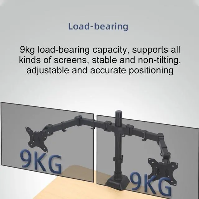 Sturdy Construction: The strong aluminum alloy frame and C-clamp hardware provide excellent stability even during movement or adjustments. Our dual arm monitor holder supports a 19.8 lbs screen for and is compatible with most 17-32inch monitors.