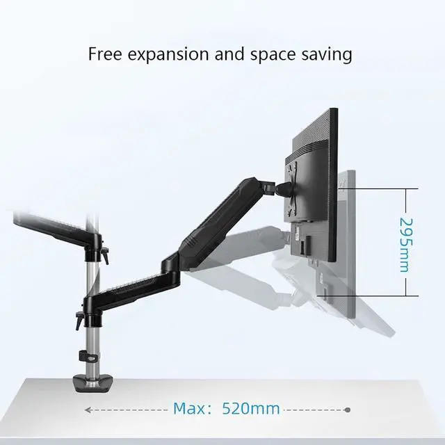 Adjustable Gas Spring Arms: Height adjusts up to 295mm with 520mm reach for ergonomic positioning and comfortable viewing angles.