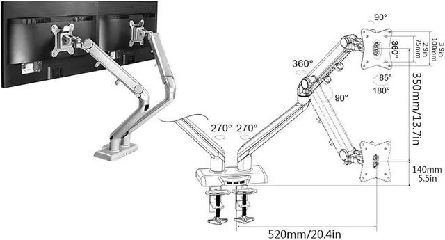 Dual Monitor Compatibility: Fits two monitors sized 17" to 32" and weighing up to 19.8 lbs each, with VESA 75x75 & 100x100 mounting