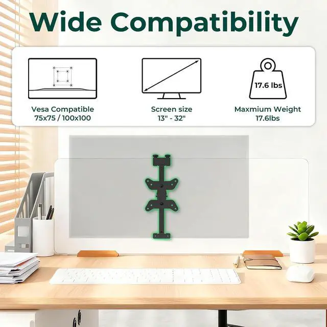 ---Wide Compatibility--- Compatible with 17" to 32" monitors weighing up to 17.6 lbs. This Office Cubicle Monitor Mount Bracket supports VESA 75x75mm and 100x100mm mounting patterns, making it suitable for a wide range of monitor brands and models.