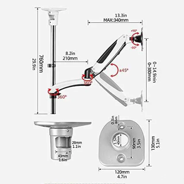 This gas spring single monitor stand allows your screen to be adjusted from -80° to +90° pitch angle, 14.9 inches up and down, and free to switch between horizontal and vertical screens to obtain the best direction for efficient work