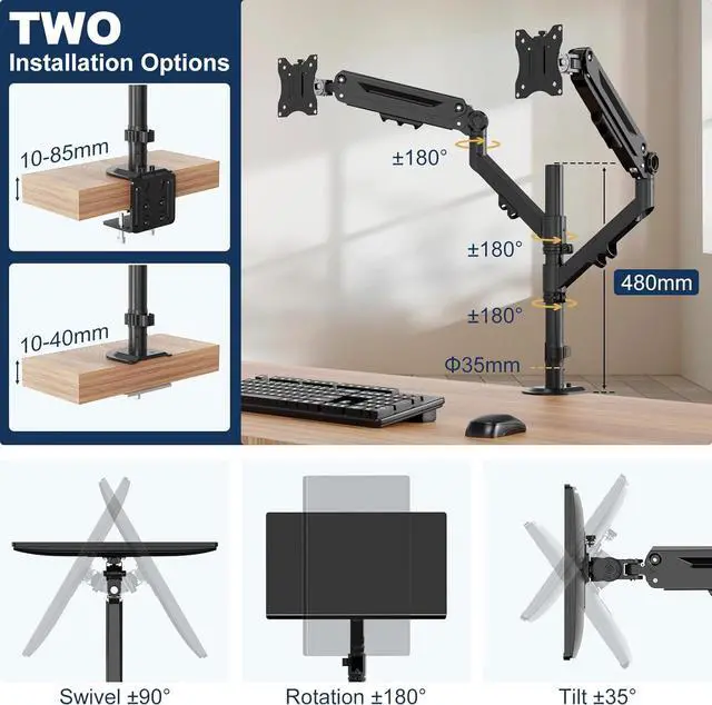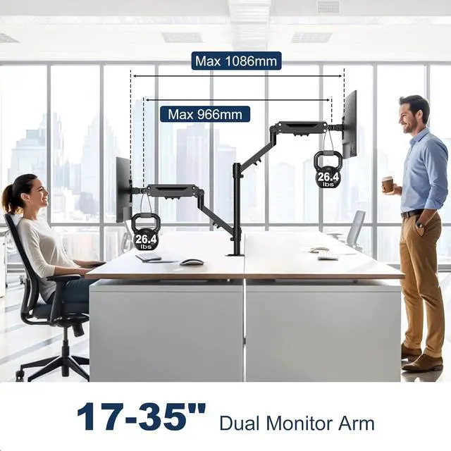 Versatile Dual Monitor Stand: Easily arrange two 17-35" monitors side-by-side with VESA 75x75/100x100 mm (up to 37.6" arm span) Note: for some special screen cant be placed side by side, stacked placement will also be a good choice.