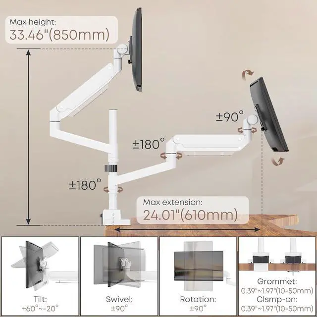 Easy Assembly with Clear Instructions: Quick setup with an included toolkit and two installation options (clamp or grommet mount) that fit desks from 10~50mm thick. Clear instructions ensure no hassle during installation