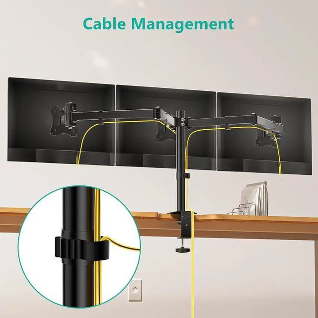 Desk Space Saver: Conveniently frees up more valuable work space by elevating 3 monitors off of your desk, making your workstation spacious and clutter-free. Integrated cable management to keep cables tucked in arm neatly, hide the sore eyes wire clutter.