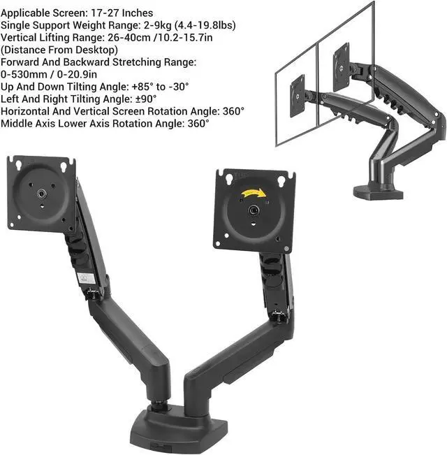WIDE COMPATIBILITY: It supports screens ranging from 17 to 27 inches and can hold up to 9KG per arm. It is compatible with for VESA mounting standard hole distance, ensuring a seamless fit for various brands and models, making it ideal for gaming.