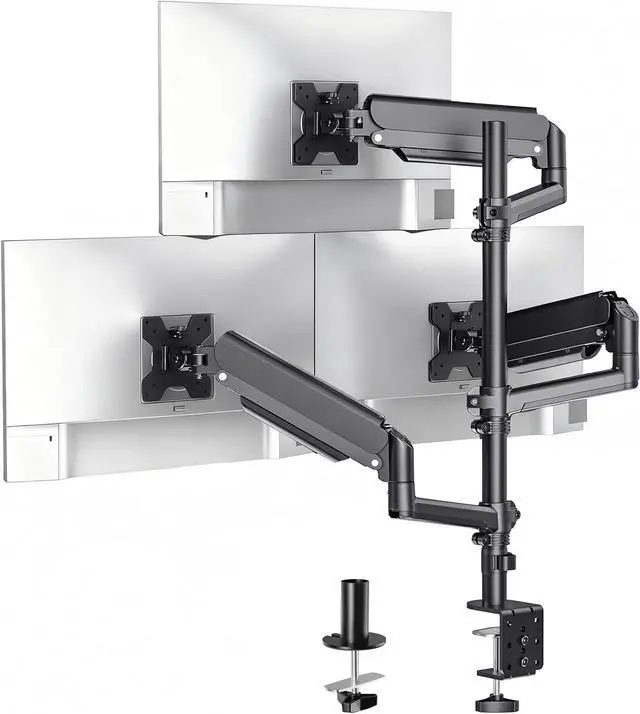 Full Motion Gas Spring Monitor ArmThe 3 monitor desk mount tilt your screen from +70° to -45°, swivel it 180°, and rotate it 360° from landscape to portrait, providing you an optimal viewing angle. This full motion monitor desk mount can be positioned or stacked in many different ways.