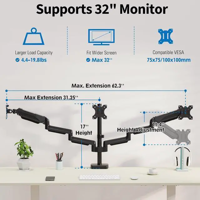 Optimize Your View - Our fully adjustable triple monitor arm offers a wide range of movement. Supports screen rotates 360° for landscape or portrait orientation, swivels 180° to share your display, and tilts up 90°/down 90° for better viewing. Plus, the 2 gas spring arms can easily extend, retract, and adjust the height dynamically. With multiple screen combinations, you can easily find the optimal viewing angle and position for comfortable work.