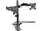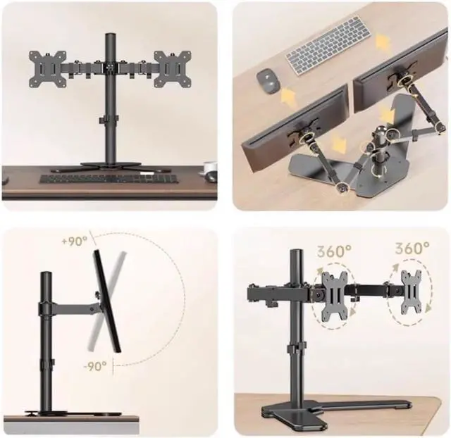 Double Benefits: This dual monitor desk stand has double efficiency and productivity to make working or relaxing that much more comfortable. Adjustable arms offer +90° to -90° tilt, 360° swivel, 360° rotation, and height adjustment along the center pole. Monitors can be placed in portrait or landscape positions.