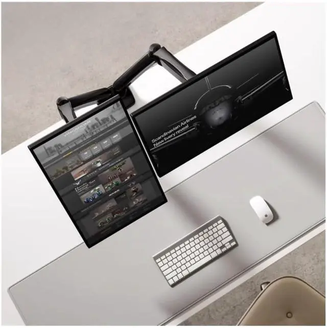 The dual monitor arm allows you to customize how you work or collaborate with 135° tilt, 360° swivel, and 360°rotation (from portrait to landscape). Each connection of the arm is adjustable. You'll be able to pose your screen where you want it.