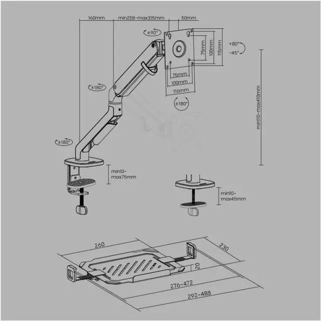 With multiple arm joints this articulating laptop arm allows for easy adjustment of the height and direction of the tray above the desk. Adjustment arm with 360 degree swing, maximum extension length of 18.7 inches, 125 degree tilt range, and max lift of 16.1".