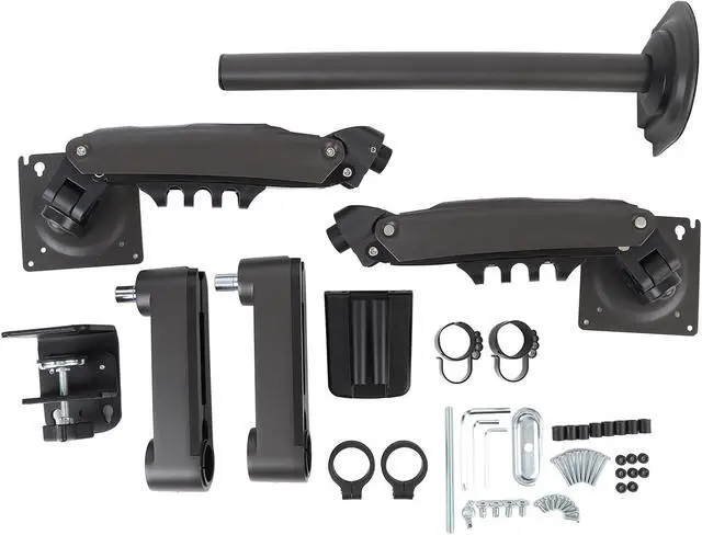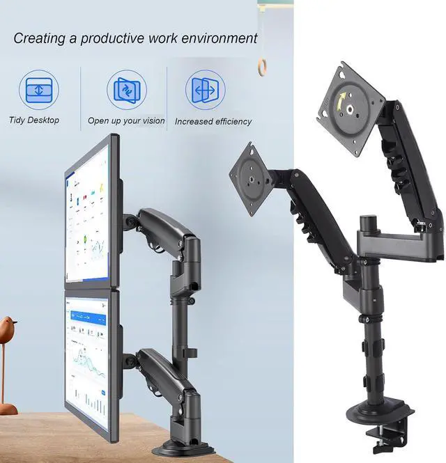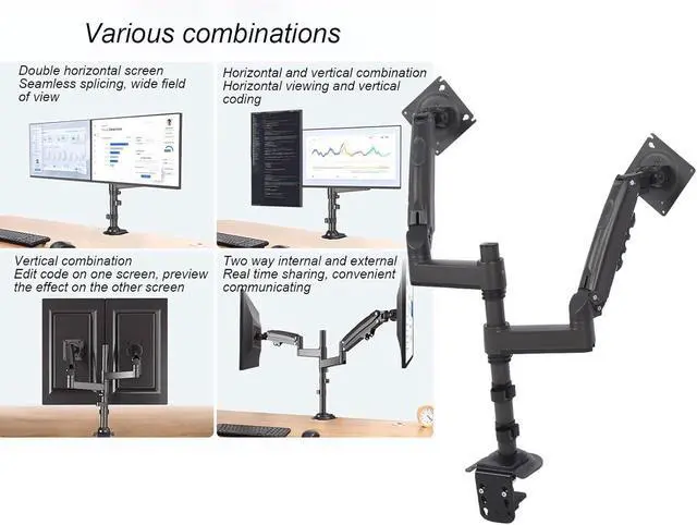 Space Optimization And Aesthetic Design: This Duals display stand is designed to optimize work and living spaces. By utilizing a suspended installation, it effectively frees up valuable desk space, allowing for more orderly placement of items like files and keyboards. It maintains a visually tidy and attractive environment, significantly improving the work space.