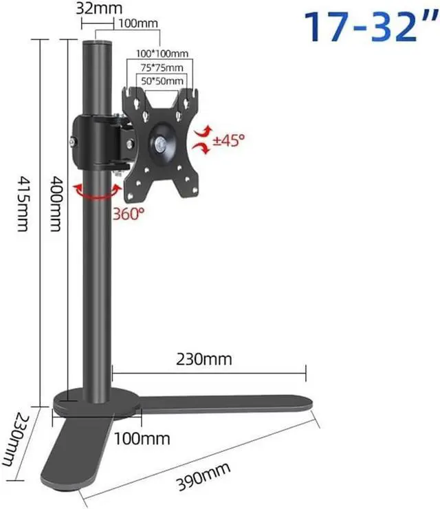 Screen Compatibility - Single monitor freestanding mount fits screens weighing up to 17.6 lbs with VESA 50x50mm, 75x75mm or 100x100mm backside mounting holes. This covers most monitors on the market between 17 and 32.