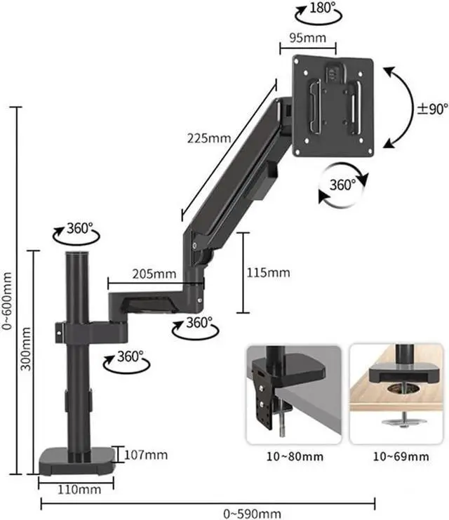 Fully Adjustable: The gas spring stand can tilt +90°/-90°, swivel +90°/-90°, and rotate 360°. Max height is up to 23.62", and max extension is up to 23.22".