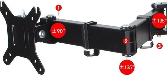 Full Articulation - Adjustable mount offers +45° to -45° tilt, 180° swivel, 360° rotation, and height adjustment along the center pole. Warning: Please do not pull monitor(s) too far forward or backward beyond the stand's center of gravity, as this will cause stability issues.
