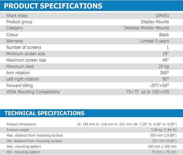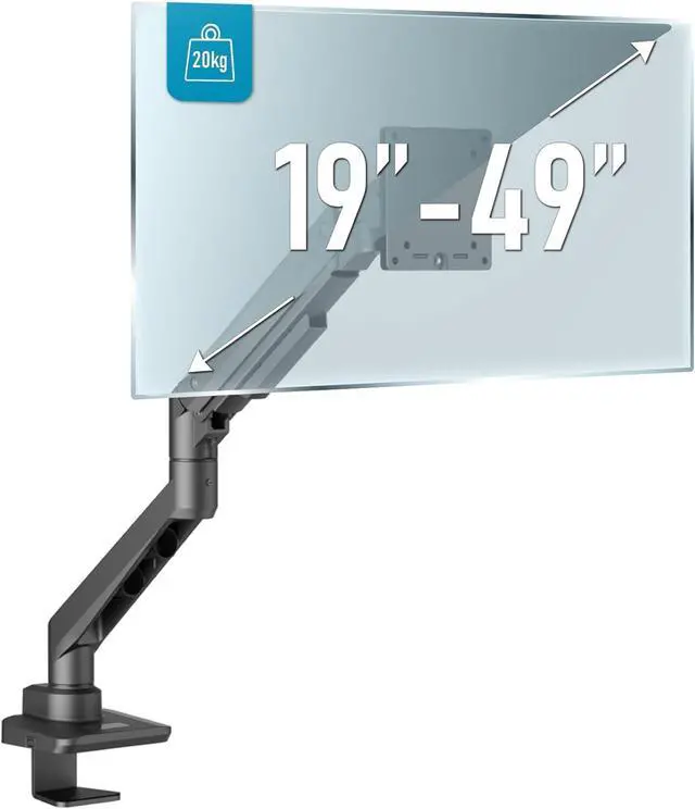 VESA compatibility: the monitor arm is compatible with VESA mounting standards from 75 x 75 to 100 x 100 mm, which allows the attachment of most monitors available on the market from 19" to 49". In addition, a maximum load capacity of 20 kg guarantees a secure and stable mount even for heavier screens.