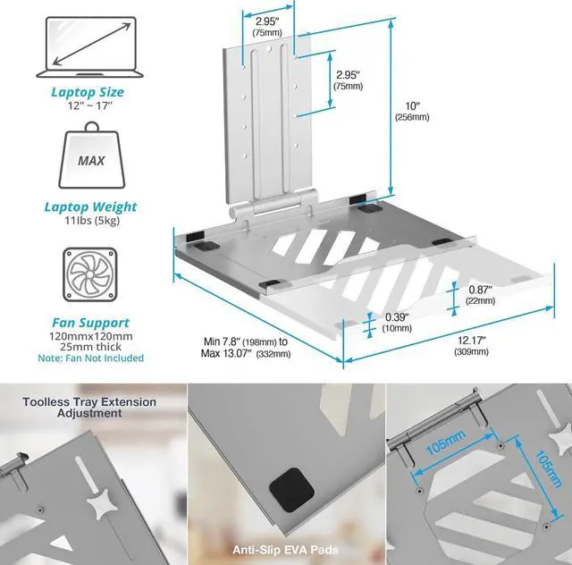 • Laptop Tray With Fan Mount: Use as a dual monitor setup or monitor plus laptop configuration; tray accommodates laptops or tablets and includes fan mount option (fan not included).