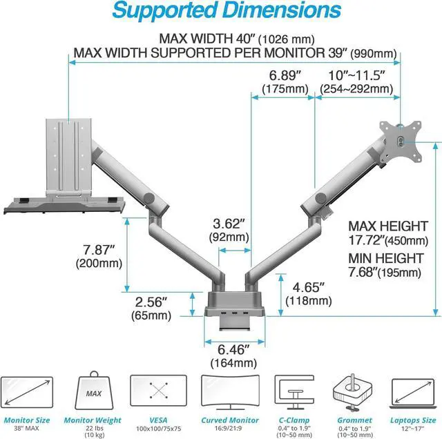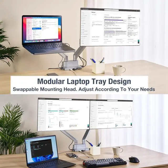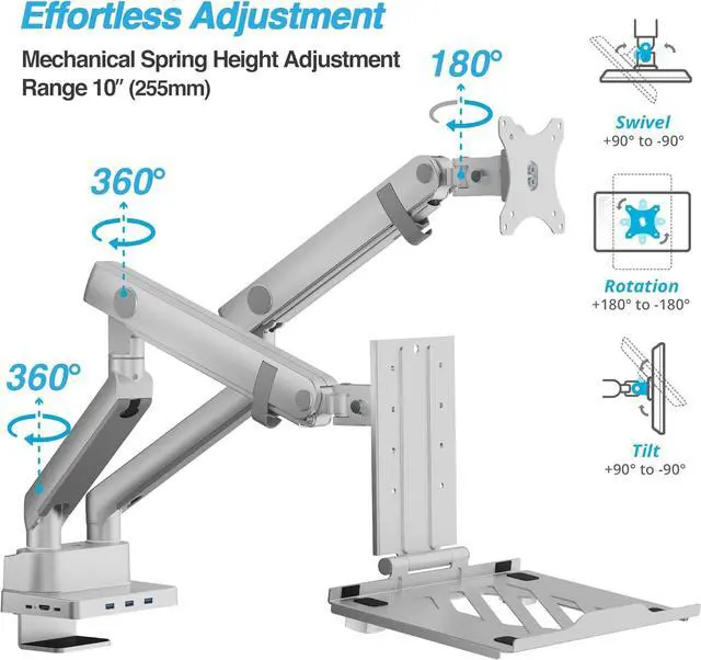 • Dual Arm Mount With Laptop Tray: Heavy-duty mechanical spring arms support a monitor and an adjustable laptop tray; includes quick-release VESA plate for easy installation.