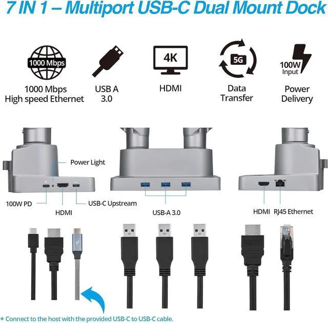 • 7-in-1 Docking Station Base: Integrated base includes 3 USB-A 3.0 ports (5 Gbps), 2 HDMI ports (MST), 1 RJ45 Ethernet port (1 Gbps), and 1 USB-C 100W PD input; requires full-function USB-C 3.1 Gen 2 port or above.