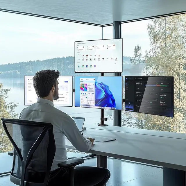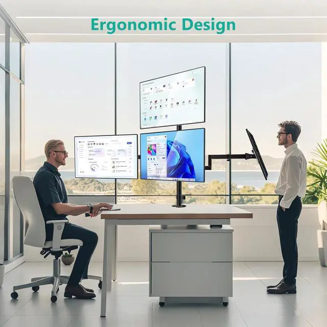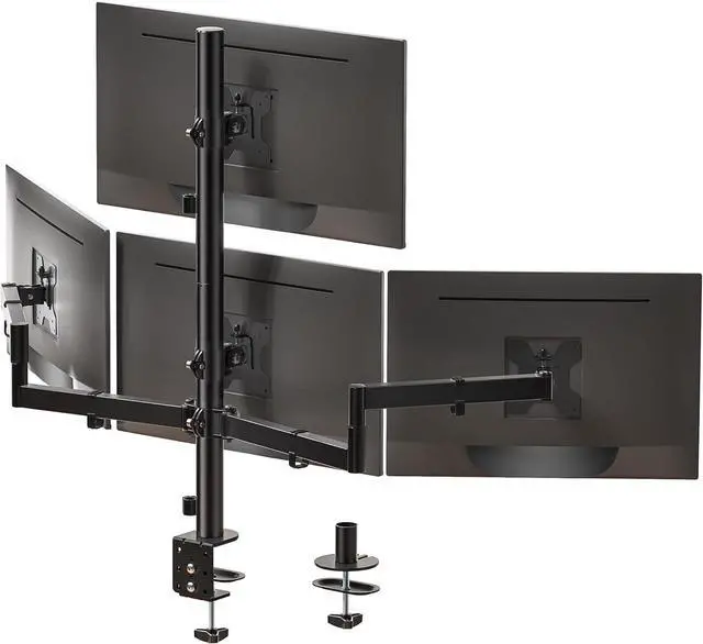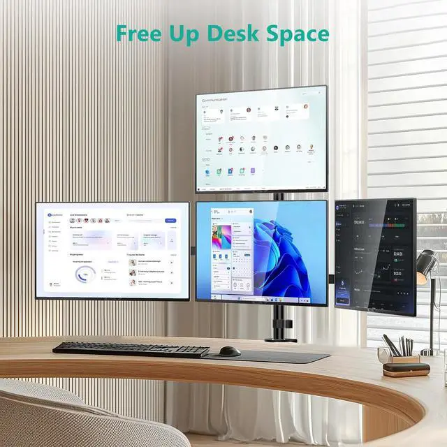 Desk Space Saver: Conveniently frees up more valuable work space by elevating 4 monitors off of your desk, making your workstation spacious and clutter-free. Integrated cable management to keep cables tucked in arm neatly, hide the sore eyes wire clutter.