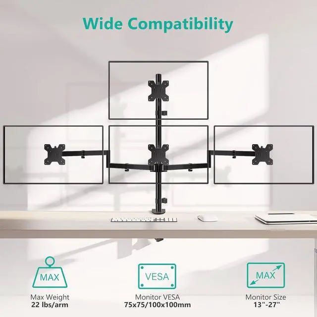 Universal Compatibility: WALI quad monitor mount perfectly fits most LED/LCD flat or curved computer screens up to 27 inches, max holds 22 lbs. Mounting Holes applicable 75x75mm or 100x100 mm. We recommend that you carefully verify this information before making a purchase.