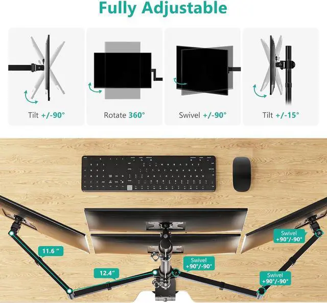 Fully Adjustable Mount Arms: The monitor arm can tilt +35°/-35°, swivel +90°/-90°, and rotate 360°, Max height is up to 31.65", and max extension is up to 51.2". The 4 monitor stand allow easy to adjust monitors swivel, tilt and rotate to find an optimal view angle and position for comfortable work.