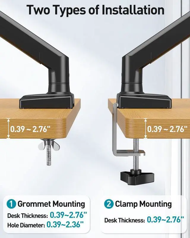 Easy Installation - The sturdier computer monitor mount provides two ways that can be quickly installed once your desk thickness within 0.39"-2.76", C-Clamp mounting and grommet mounting are available. And the separate VESA plate creates more easy monitor installation