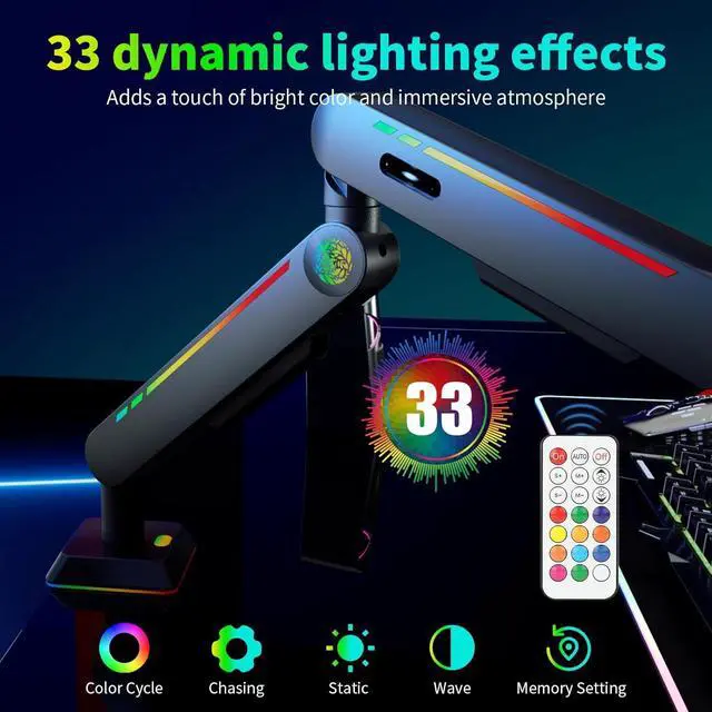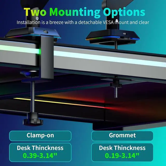 Adjustable Desk Mount: Gas spring clamp design enables smooth height, tilt, and swivel adjustments.