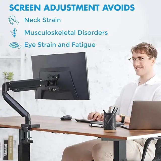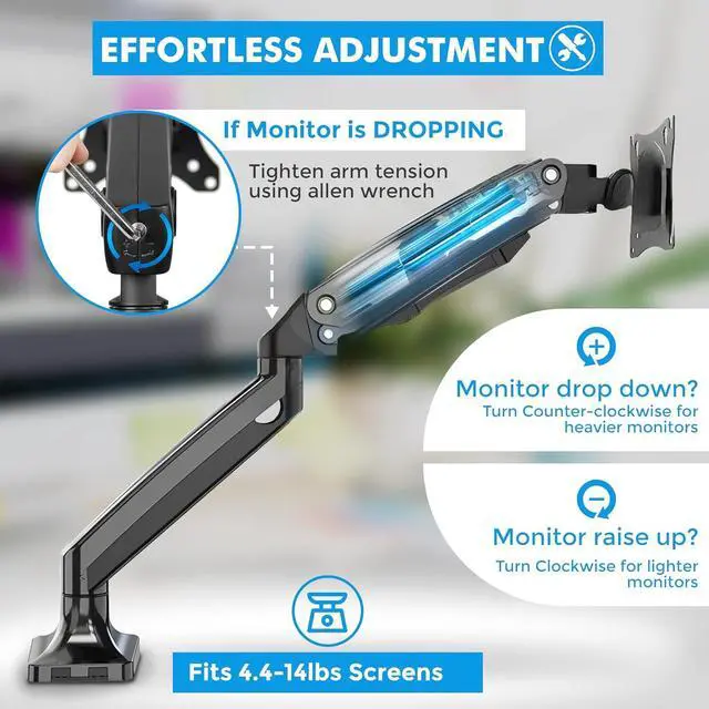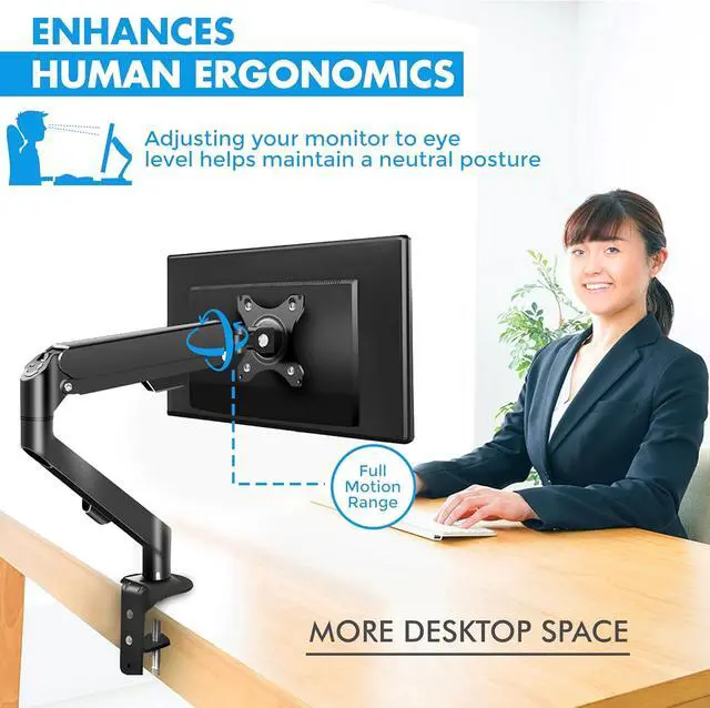 Adjustable Gas Spring Arm: Enjoy effortless monitor height adjustment with the advanced gas spring system, offering smooth and precise positioning for monitors from 13 to 24 inches.