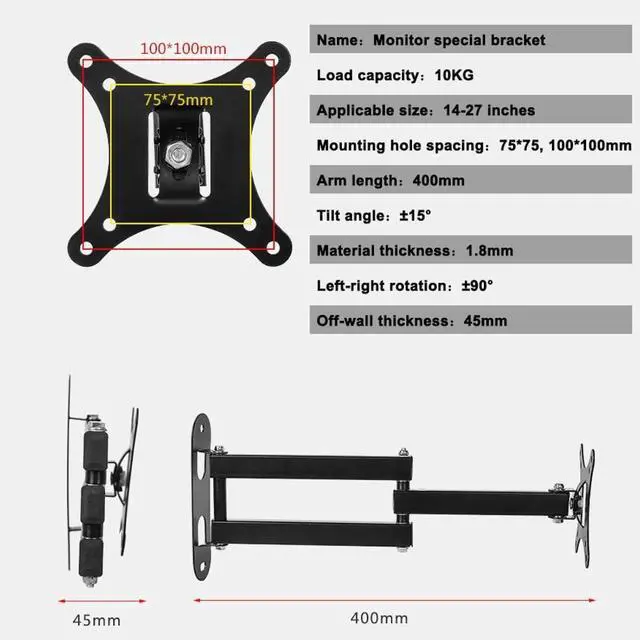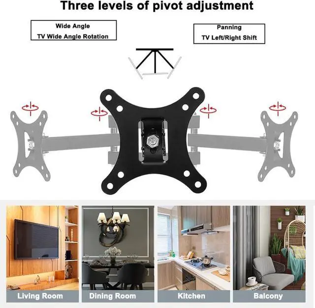 TV Bracket CompatibilityThis TV bracket is suitable for most brands of 14-27 inch TVs, size range from 75x75mm to 400x400mm, load capacity 10KG.Suitable for wood studs and solid concrete wall mounting. For better experience, please confirm the size and weight of your TV before purchase.