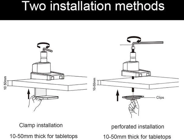 TWO DESK MOUNT OPTIONS - The unit can be mounted using the provided C-clamp or by using perforated installation. Clamp method fits most desks 1-5cm/0.39-1.96inch thick while perforated installation fits desks 1-5cm/0.39-1.96inch thick