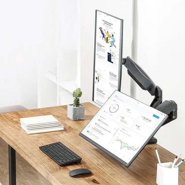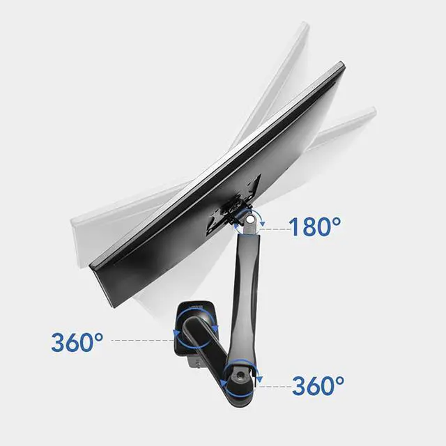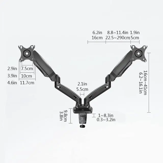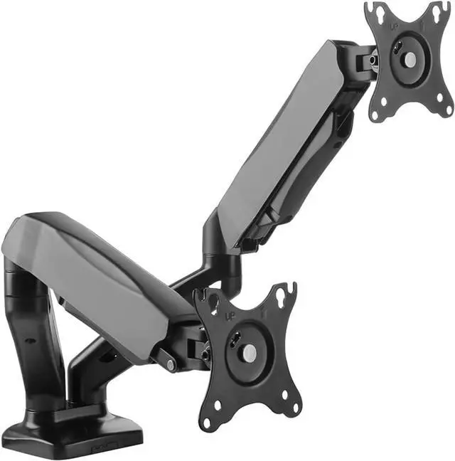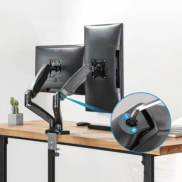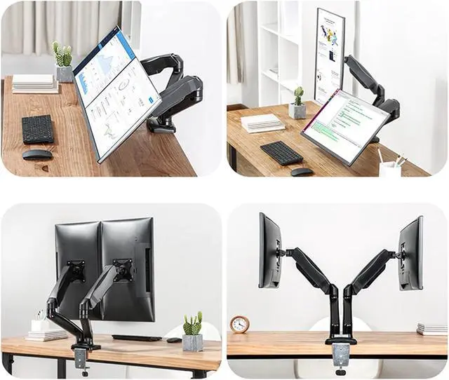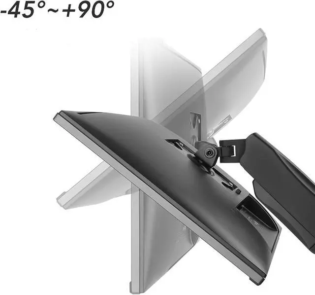 This gas spring dual monitor bracket has +90° to -45° tilt, 90° rotation left and right, 180° screen rotation function, 9.8 inches of height adjustment, which helps to create an ideal viewing angle and ergonomic viewing Position, the computer monitor can be placed in portrait or landscape shape