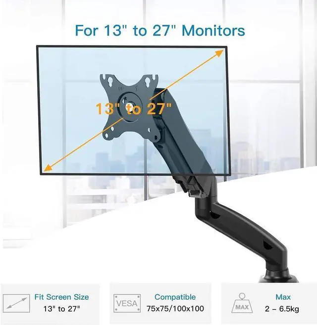 UNIVERSAL MONITOR STAND - Gas spring monitor arm for the 17 to 27 inches (diagonal between 33-68.5 cm) LED LCD monitors with VESA mounting pattern of 75x75 mm and 100x100 mm. This vesa mount is also suitable for diagonals that are smaller or larger than the screen specified in the description. Just make sure that the VESA distance is within the support range and does not exceed the load weight of the vesa arm