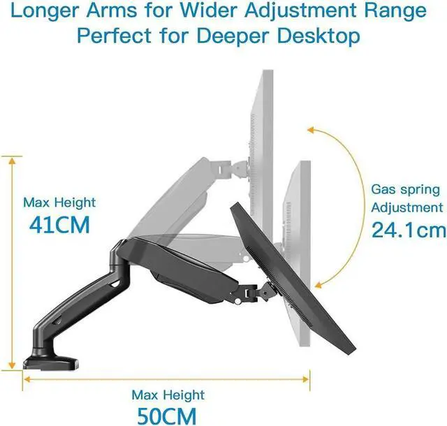 HIGH QUALITY & LONG LIFETIME - Compared to other monitor stands, our table monitor arms are equipped with gas springs instead of mechanical springs and can be adjusted to your needs continuously and without jitter and noise. The premium gas spring has passed 20,000 circle motion tests to ensure a smooth movement setting of at least 5 years (with 10 adjustments per day)