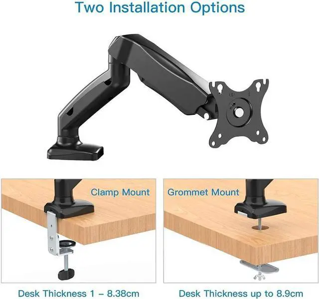 2 MOUNTING OPTIONS - Screen mount is directly mounted onto the desk which creates greater stability. Except the clamp, this monitor desk mount can also be fixed via grommet mounting hole. The clamp fits desks with a thickness up to 8.38 cm. The grommet mounting fits desks with thickness up to 8.9cm and a hole with a diameter of about 10mm