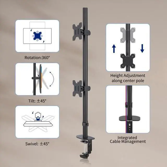 Dual advantage: The display arm can be easily adjusted on a 31.5-inch high pole. By opening up desk space, double efficiency and productivity can be achieved, making work in a more comfortable and ergonomic correct position to reduce neck and eye fatigue.